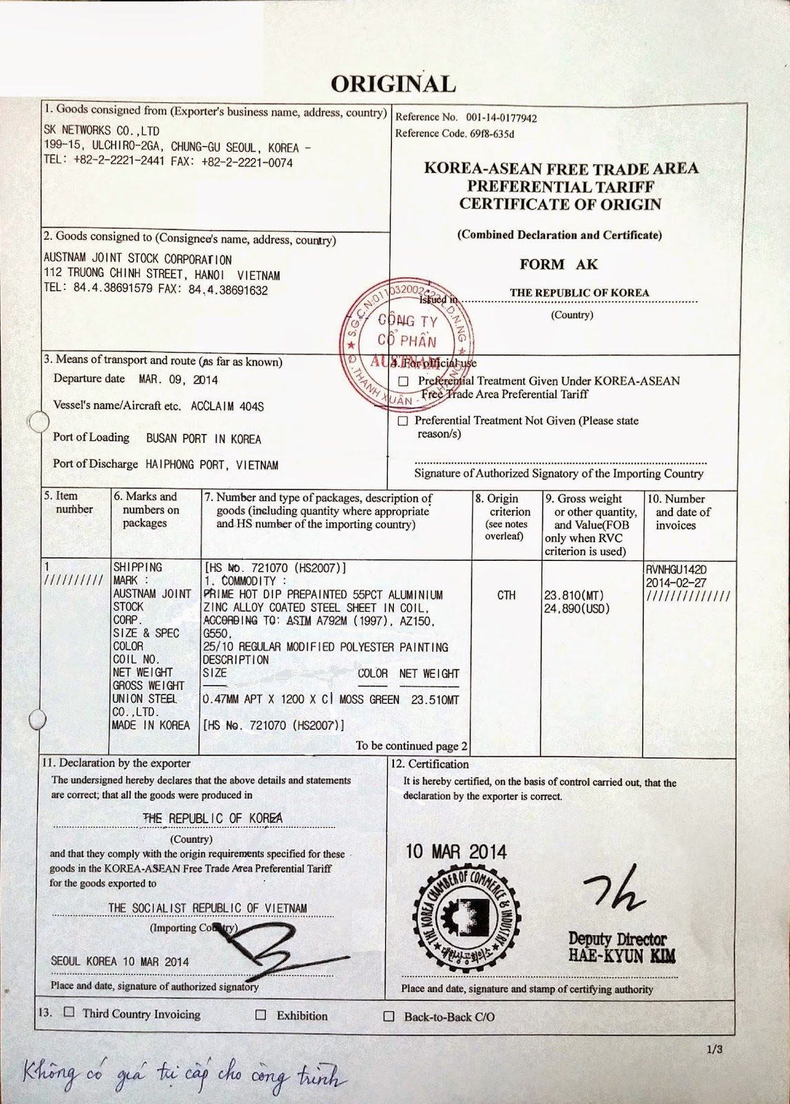 CO nhập khẩu của tôn Austnam Austnam » Chứng chỉ chất lượng Tấm lợp Tôn Austnam » CO nhập khẩu của tôn Austnam CO nhập khẩu của tôn Austnam